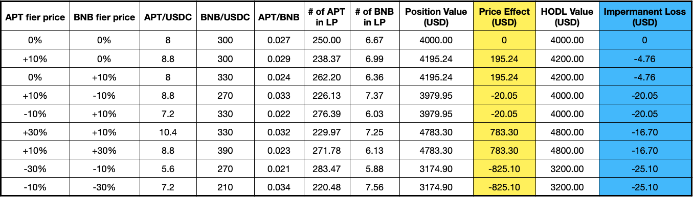 Consider the liquidity pool APT-BNB LP, with USD4,000 principal