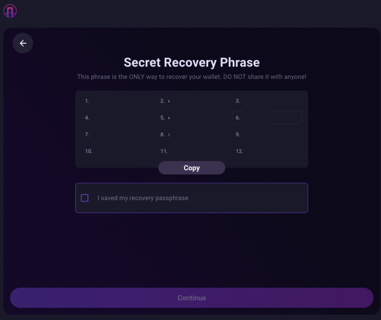 After written down your phrases, click "**`I saved my recovery passphrase`**" to proceed.<br>